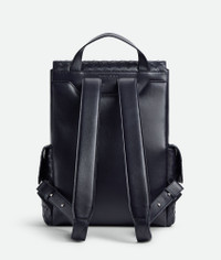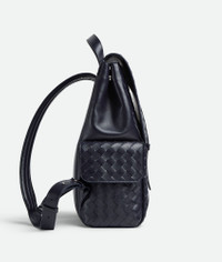 Backpack in Intrecciato leather. Product Details - Intrecciato leather backpack - Two exterior flap pockets - Single interior laptop compartment and two open pockets - Flap closure - Lining: Canvas - Color: Nocturnal - Hardware: Silver finish - Made in: Italy - Product code: 805971V2HL14182 Material - Material: Calfskin Size & Fit - Height: 46 cm (18.1") - Width: 30 cm (11.8") - Depth: 14 cm (5.5") - Handle drop: 6 cm (2.4") - Fits a 16" laptop, A4 documents, and a tablet