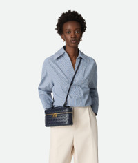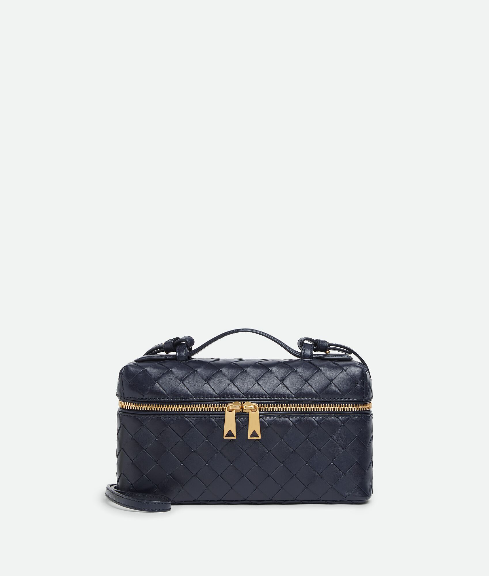 Vanity case in Intrecciato leather with detachable strap. Product Details - Intrecciato leather vanity case with detachable strap - One main compartment, one flat pocket - Zipper closure - Lining: Calf leather - Color: Nocturnal - Hardware: Gold finish - Made in: Italy - Product code: 789109V3IV14183 Material - Material: Calfskin Size & Fit - Height: 12.5 cm | 4.9" - Width: 22 cm | 8.7" - Depth: 5 cm | 2" -Handle drop: 4.5 cm | 1.8" -Strap drop: 45 cm | 17.7" - Fits iPhone 16 Pro Max, a credit card case, airpods and keys.