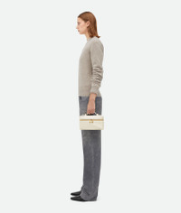 Intrecciato leather vanity case with detachable strap. Product details • Mini Intrecciato leather vanity case with detachable strap • One main compartment • Zipped closure Material: Calfskin • Lining: Calfskin • Color: Sea Salt • Hardware: Gold finish • Height: 12.5 cm | 16.9" • Width: 23 cm | 1.4" • Depth: 4 cm | 1.6" •Strap drop: 20 cm | 7.9" Made in: Italy Size & fit • Fits iPhone 15 Pro Max.