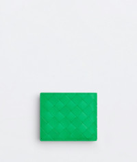Intrecciato leather wallet. Make it unique with a handmade customization by Product details • Intrecciato leather wallet • Four card slots, two bill compartments, two additional pockets, one coin purse Material: 100% Calfskin • Lining: Calfskin • Color: Parakeet • Hardware: Silver finish • Height: 9.5 cm | 3.7" • Width: 11 cm | 4.3" • Depth: 1 cm | 0.4" Made in: Italy