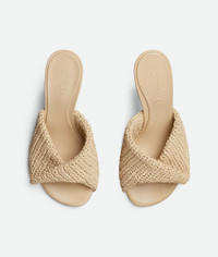 Mule sandal with a folded detail in crochet raffia. Product Details - Crochet raffia mule sandal - Folded detail - Material: Raffia, lambskin - Unlined - Colour: Natural - Rubber/injected leather outsole - Heel: 8 cm | 3.1” - Made in: Italy - Product code: 827728V0GN09218