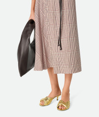Kitten heel mule with a folded detail in Intrecciato laminated leather. Product Details - Intrecciato laminated leather kitten heel mule sandal - Folded detail - Material: Lambskin - Unlined - Color: Gold - Rubber-injected leather outsole - Heel: 5 cm | 2” - Made in: Italy - Product code: 796464V55N17890