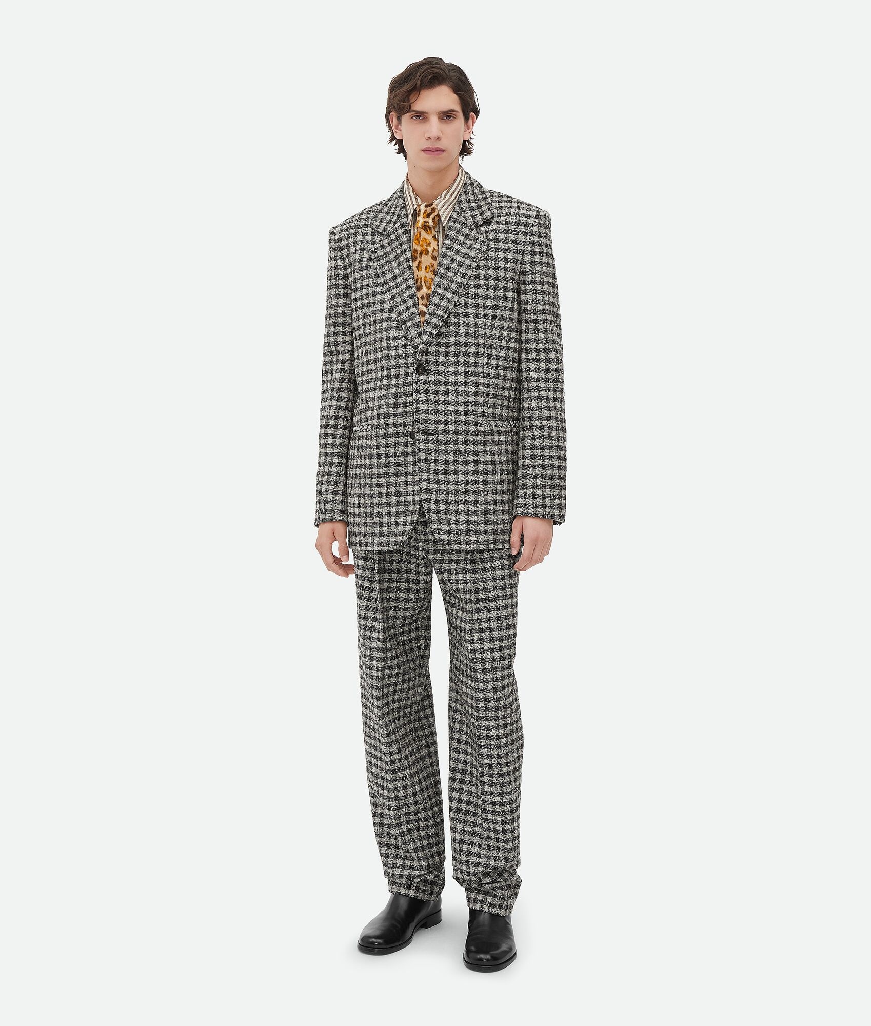 Single breasted jacket in gingham boucle wool. Product Details - Boucle gingham wool single breasted jacket - Special label on the interior - Button closure - Fully lined - Regular fit - Material: 90% wool, 10% polyamide - Color: Black/Pearl/Khaki - Made in: Italy - Product code: 812150V4Y901759 Size & Fit - Model is 190 cm|6'2" and is wearing a Bottega Veneta size 46