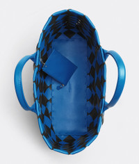 Product Details - Large intrecciato leather tote bag - Single detachable interior zipped pocket with exterior card slots - Material: lambskin - Lining: Lambskin bonded Intrecciato - Color: Signal Blue/Black - Hardware: Silver finish - Height: 62 cm | 13.9" - Width: 41 cm | 13.3" - Depth: 17 cm | 6.2" - Handle Drop: 19 cm | 8.6" - Made in: Italy - Product code: 569041VMAA01150