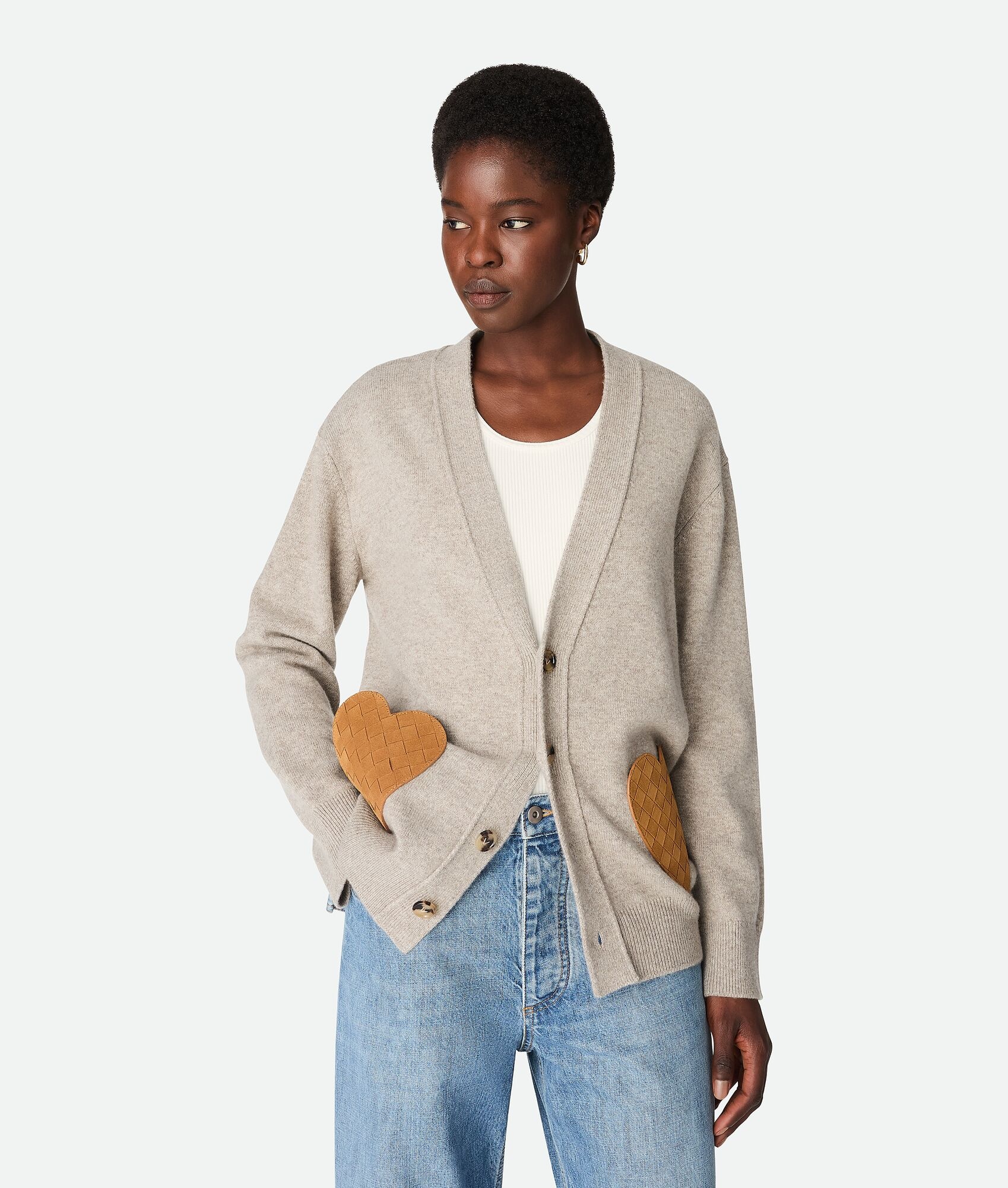 Cardigan in classic midweight cashmere with Intrecciato suede heart-shaped pockets. Product Details - Midweight classic cashmere cardigan - Intrecciato suede heart patch pockets - Button closure - Regular fit - Color: Stone Melange - Made in: Italy - Product code: 838109V2MM01502 Size & Fit - Model is 179 cm | 5'10" and is wearing a Bottega Veneta size S