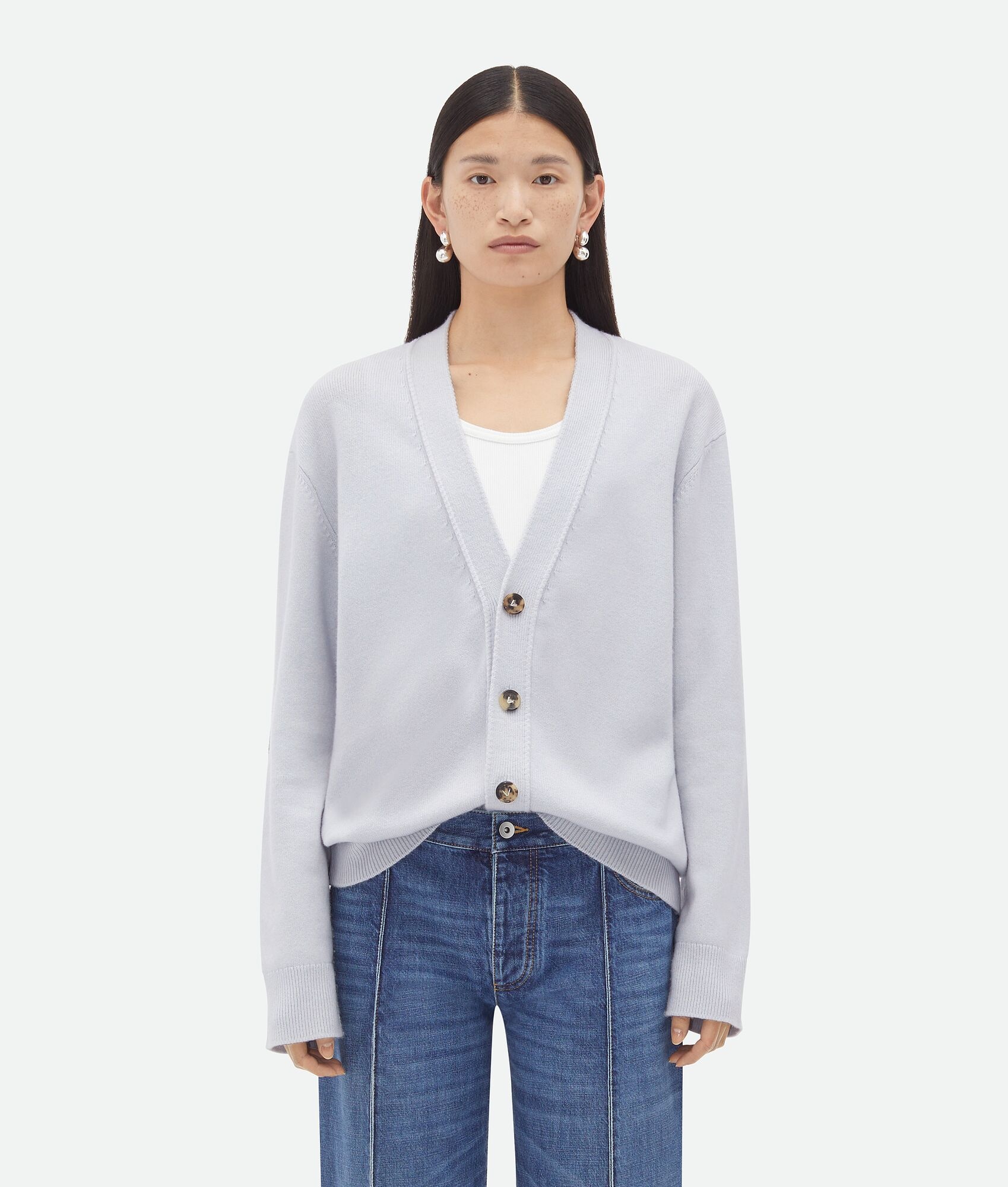 Cardigan in classic cashmere with signature Intrecciato leather patches. Product Details - Classic cashmere cardigan - Intrecciato leather patches detail - Button closure - Relaxed fit - Material: 97% Cashmere, 2% Polyamide, 1% Elastane - Color: Morning Mist - Made in: Italy - Product code: 774699V2MM01582 Size & Fit - Model is 180 cm | 5'11" and is wearing a Bottega Veneta size S
