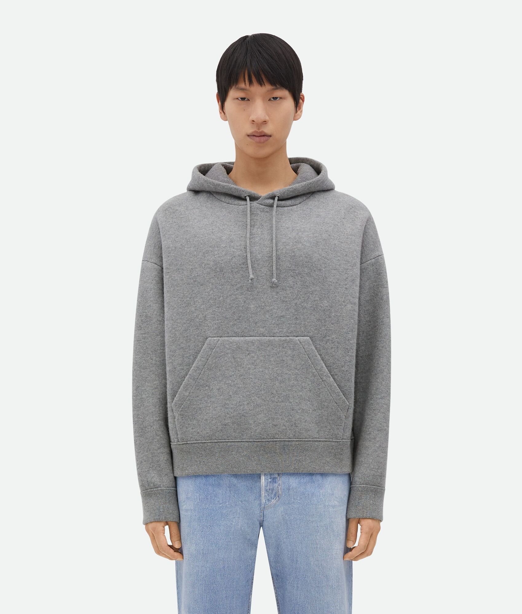 Compact cashmere hoodie. Product details • Compact cashmere hoodie • Relaxed fit Material: 100% Cashmere • Color: Light Gray Melange Made in: Italy Size & fit • Model is 186 cm|6'1" and is wearing a Bottega Veneta size S