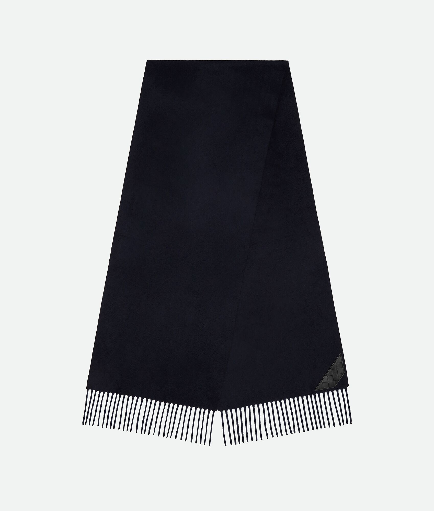Scarf in soft cashmere with Intrecciato leather patch. Product Details - Cashmere scarf - Intrecciato leather patch - Color: Navy 302 - Made in: Italy - Product code: 845830V3VU09903 Material - Material: 100% cashmere Size & Fit - Length: 180 cm | 70.9" - Width: 36 cm | 14.2"