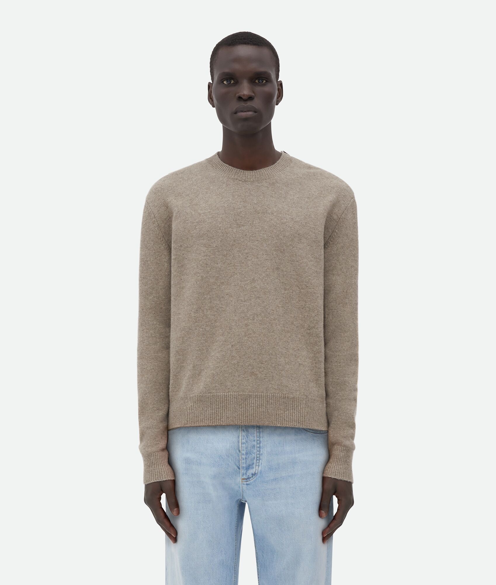 Cashmere sweater. Product Details - Cashmere sweater - Buttons on shoulder - Regular fit - Material: 97% Cashmere, 2% Polyamide, 1% Elastane - Color: Desert - Made in: Italy - Product code: 752153V2MM09734 Size & Fit - Model is 185 cm|6' and is wearing a Bottega Veneta size S