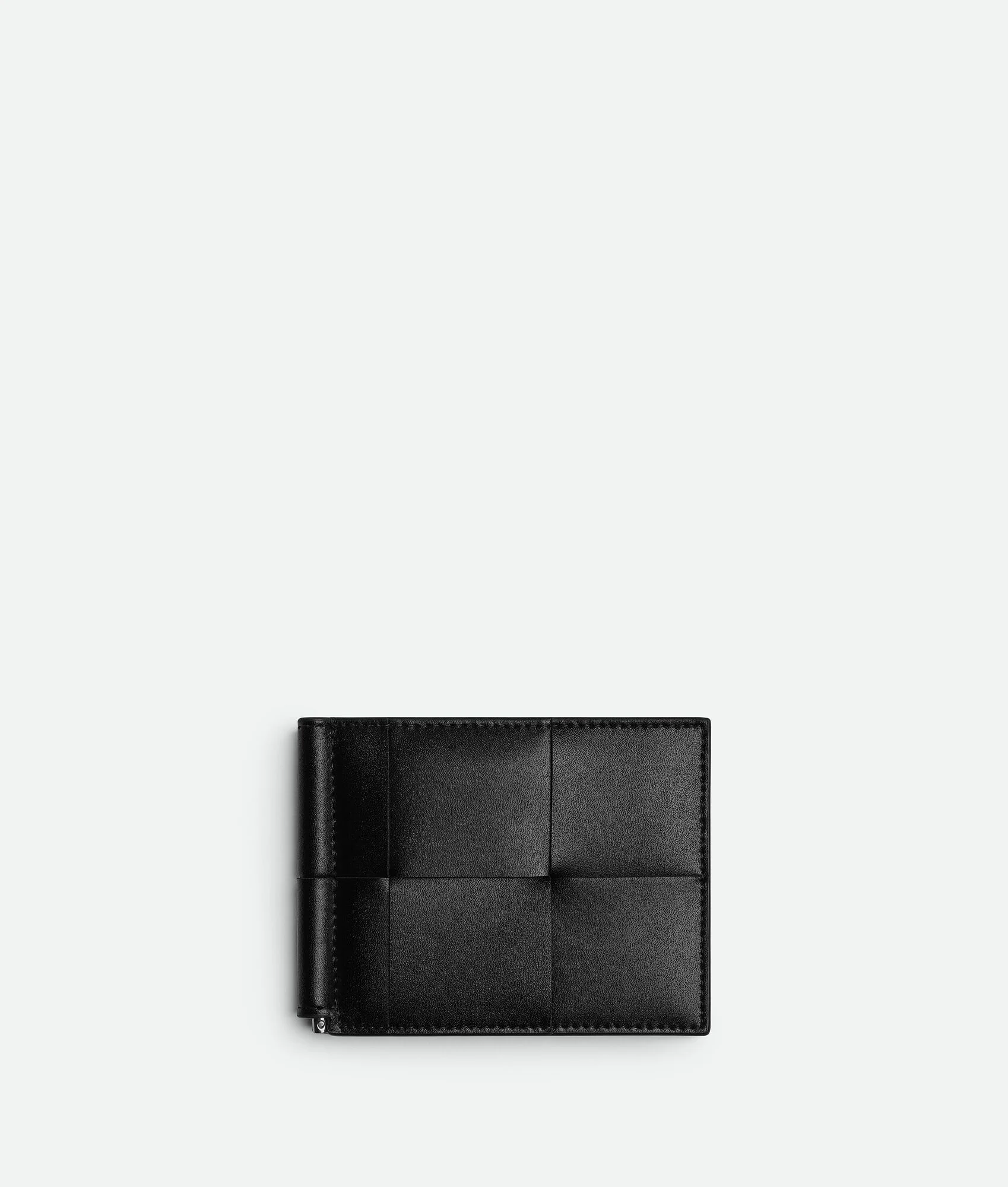 Intreccio leather wallet. Make it unique with a handmade customization by our Product Details - Intrecciato leather wallet - Six card slots, one metal clip - Material: calfskin - Lining: Calfskin - Color: Black - Hardware: Silver finish - Height: 9 cm - Width: 11.5 cm - Depth: 0.5 cm - Made in: Italy - Product code: 749453VBWD28803