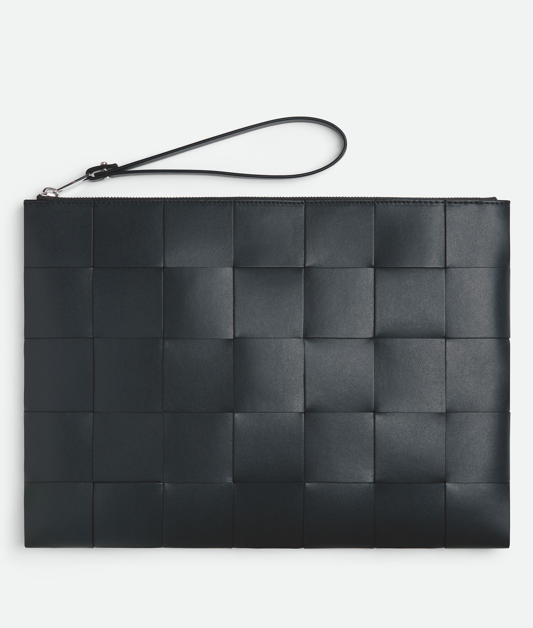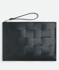 Flat pouch in Intreccio calf leather with contrasted interior and wristlet. Product Details - Intreccio calf leather pouch with contrasted interior and wristlet - Single interior open pocket - Zipper closure - Material: Calfskin - Lining: Calf leather bonded Intreccio - Color: Ardoise/Cypress - Hardware: Silver finish - Height: 25 cm | 9.8" - Width: 35 cm | 13.8" - Depth: 1 cm | 0.4" - Handle drop: 18 cm | 7.1" - Made in: Italy - Product code: 649616VBWD52073