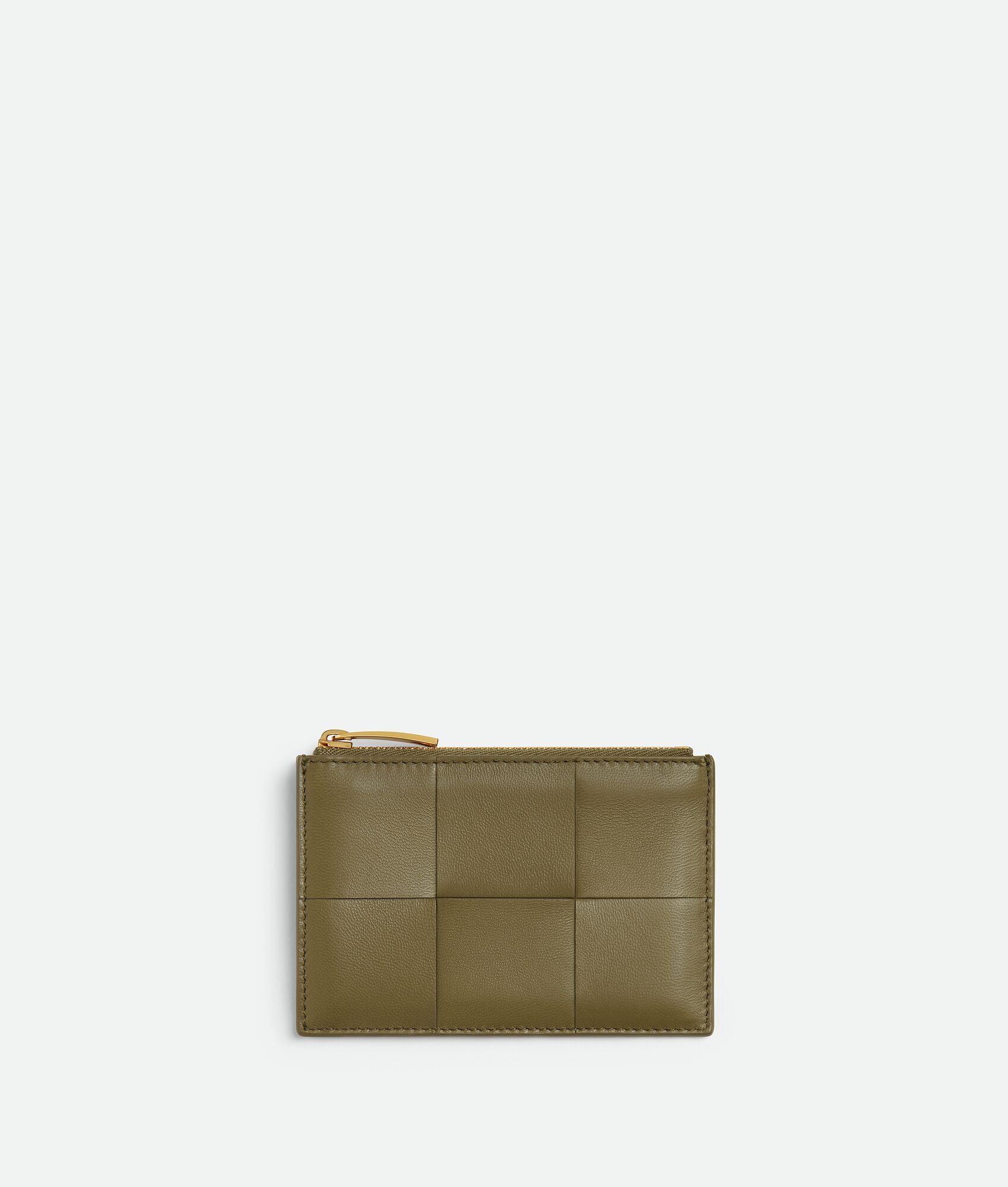 Intreccio bi-colour nappa leather card case. Product Details - Three card slots, one additional pocket, one zipped coin purse with gusset - Material: Lambskin - Lining: Calfskin - Color: Algae/Dark Praline - Hardware: Gold finish - Height: 8 cm | 3.1" - Width: 12 cm | 4.7" - Depth: 0.5 cm | 0.2" - Made in: Italy - Product code: 765460V58T12839