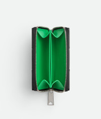 Intreccio calfskin leather coin purse with contrasted interior. Product Details - One card slot, two additional compartments - Zipper closure - Material: calfskin - Lining: Calfskin - Color: Black/Parakeet - Hardware: Silver finish - Height: 7 cm | 2.8" - Width: 10.5 cm | 4.1" - Depth: 1.5 cm | 0.6” - Made in: Italy - Product code: 790558VBWD51042