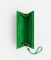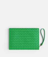 Small intrecciato leather document case. Product Details - Small intrecciato leather document case - Single exterior zipped pocket - Six interior card slots, two open pockets, one compartment - Zip closure with detachable wristlet - Material: Calfskin - Lining: Bonded suede - Color: Parakeet - Hardware: Silver finish - Height: 20.5 cm | 8.1" - Width: 27.5 cm | 10.8" - Depth: 2 cm | 0.8" - Made in: Italy - Product code: 693675V0E513724