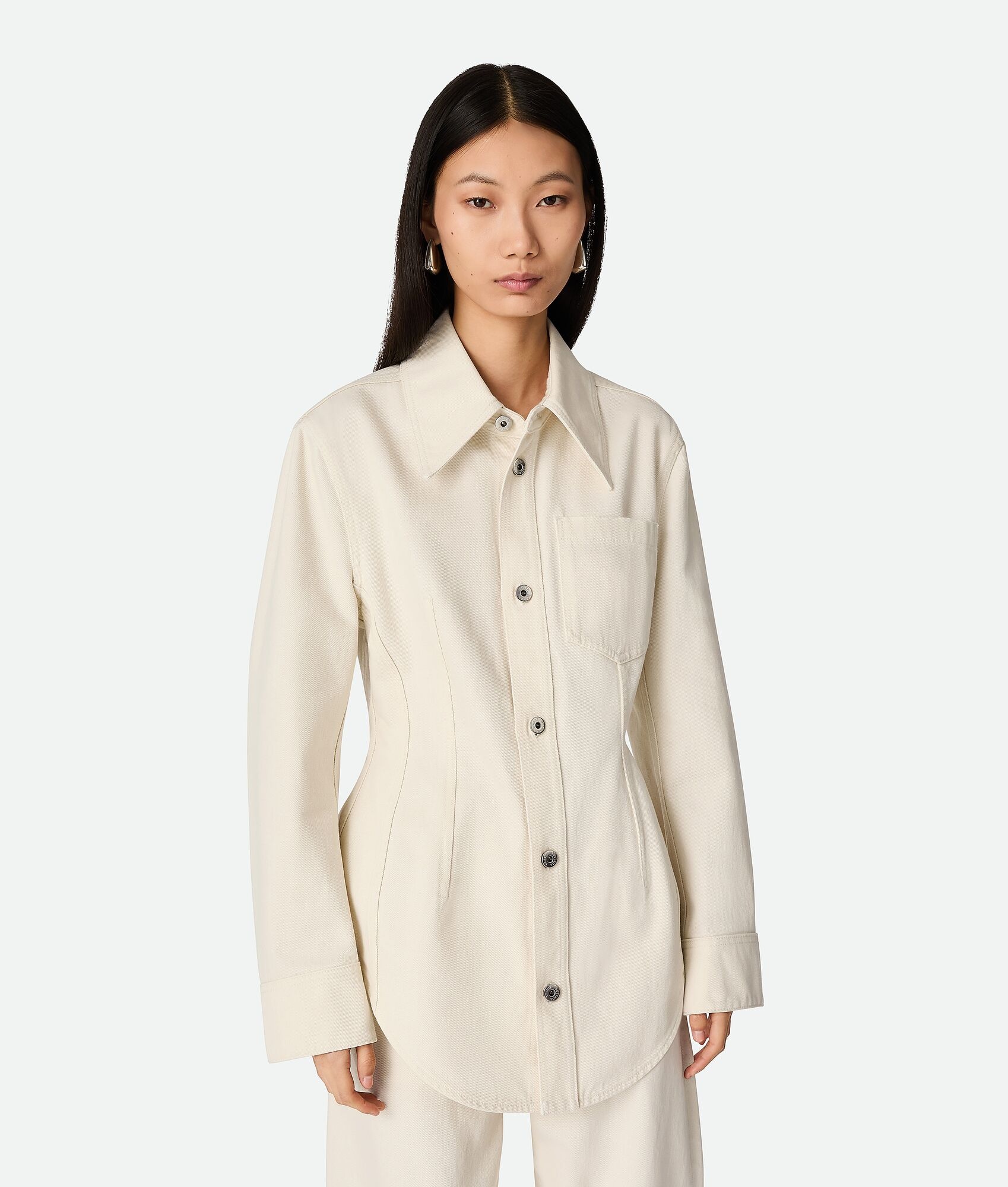Shirt in coloured stone washed denim. Product Details - Stone washed colored denim shirt - Button closure - Regular fit - Material: 100% Cotton - Color: Pale Meringue - Made in: Italy - Product code: 829180V5DV09247 Size & Fit - Model is 178 cm | 5'10" and is wearing a Bottega Veneta size 38