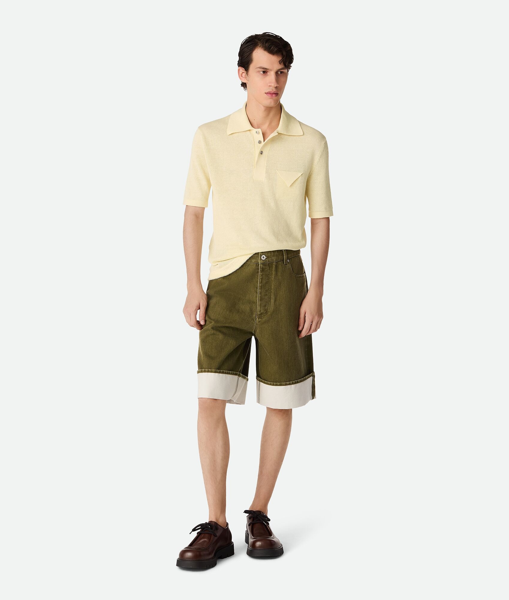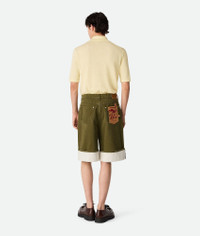 Shorts with straight leg and contrasted turned up hem in coloured stone washed denim. Product Details - Stone washed colored denim shorts - Straight leg - Contrasted turned up hem - Intrecciato suede back patch - Removable jumping hare patch on the back pocket - Button closure - Material: 100% Cotton - Color: Caper Stone Washed - Made in: Italy - Product code: 824662V5DV04056 Size & Fit - Model is 186 cm|6'1" and is wearing a Bottega Veneta size 46