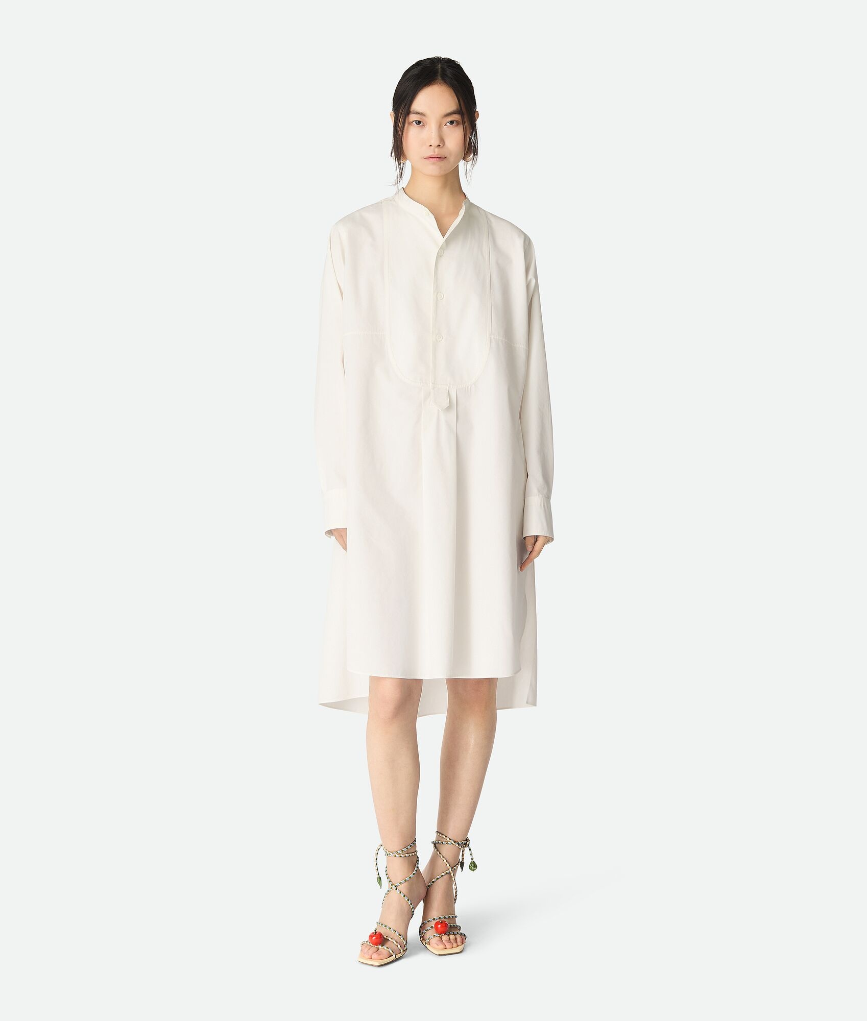 Midi dress in compact cotton with plastron detail. Product Details - Compact cotton midi dress - Plastron detail - Zipper closure - Relaxed fit - Color: Chalk - Made in: Italy - Product code: 829877VA5Y09071 Size & Fit - Model is 176 cm | 5'9" and is wearing a Bottega Veneta size 38