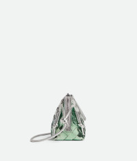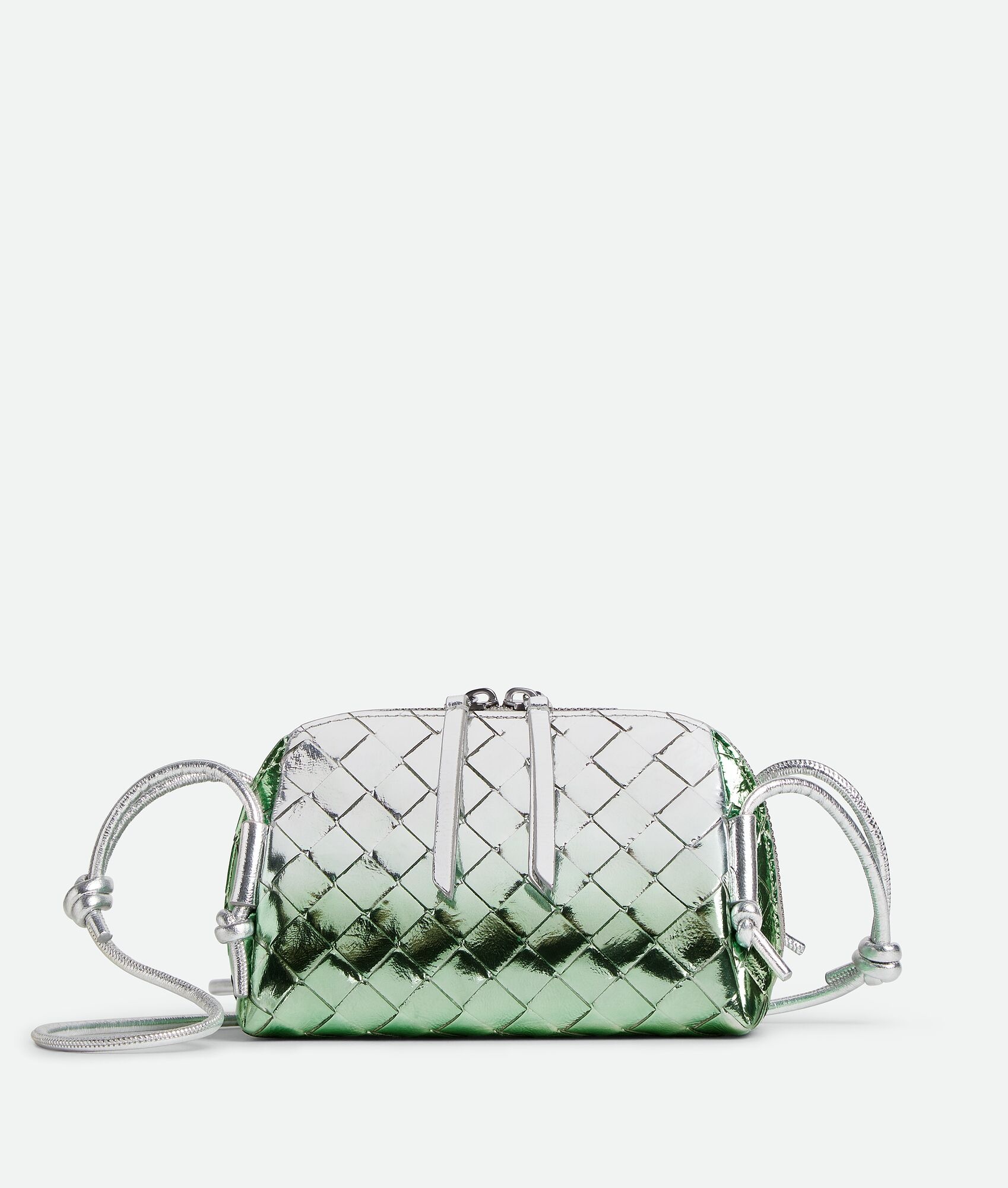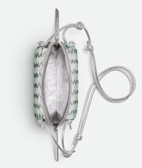 Intrecciato laminated leather pouch with degrade effect and adjustable tubular strap. Product Details - One main compartment, one interior flat pocket - Zip closure with leather zip puller - Adjustable leather tubular strap with sliding knots - Material: Goatskin - Lining: Lambskin - Colour: Silver/Fresh Mint - Hardware: Silver finish - Height: 11.5 cm - Width: 18.5 cm - Depth: 8.5 cm - Strap drop: 55 cm - Made in: Italy - Product code: 794258V5LA08119