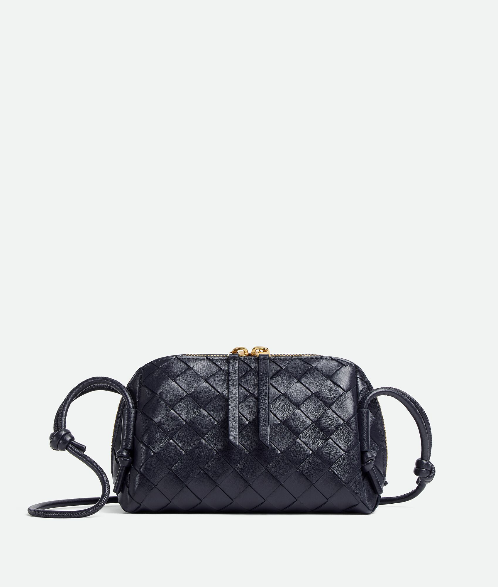 Product Details - Intrecciato nappa leather pouch - One main compartment, one interior flat pocket - Zipper closure with leather puller - Adjustable leather tubular strap with sliding knots - Lining: Calf leather - Color: Nocturnal - Hardware: Gold finish - Made in: Italy - Product code: 794258VCPP14183 Material - Material: Lambskin Size & Fit - Height: 11.5 cm | 4.5" - Width: 18.5 cm | 7.3" - Depth: 8.5 cm | 3.3" - Strap drop: 55 cm | 21.7"