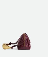 Pouch in Intrecciato piccolo nappa leather with sculptural metallic handle. Product Details - Intrecciato piccolo nappa leather pouch - One main compartment, one interior flat pocket - Zip closure with leather puller - Sculptural metal handle - Lining: Calfskin - Colour: Barolo - Hardware: Muse brass finish - Height: 11.5 cm | 4.5" - Width: 18.5 cm | 7.3" - Depth: 8.5 cm | 3.3" - Strap drop: 20 cm | 7.9" - Made in: Italy - Product code: 837086V4R022250