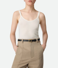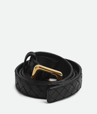 Belt in Intrecciato piccolo silky calf leather with squared metal buckle. Product Details - Intrecciato piccolo calfskin leather belt - Metal buckle - Prong closure - Lining: Calf leather - Color: Black - Hardware: Muse brass finish - Made in: Italy - Product code: 843889V5N211019 Material - Material: calfskin Size & Fit - Height: 2 cm | 0.8" - Depth: 0.5 cm | 0.2"