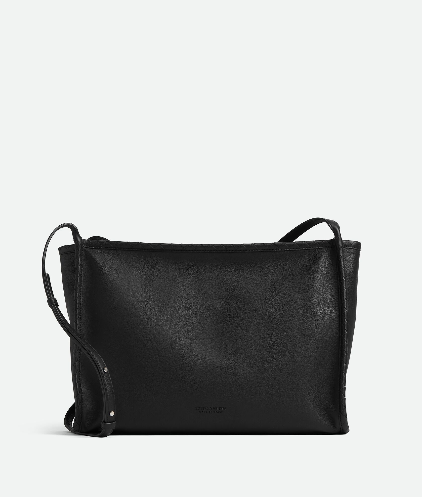 Zipped messenger in soft, grained calf leather with Intrecciato trims. Product Details - Leather zipped messenger with Intrecciato piping - Double adjustable strap with key ring and Intrecciato leather tab - Single interior zipped pocket and two flat open pockets - Zipper closure - Lining: Canvas - Color: Black - Hardware: Silver finish - Height: 29 cm | 11.4" - Width: 39 cm | 15.4" - Depth: 14.5 cm | 5.7" - Strap drop: 47.5 cm | 18.7" - Made in: Italy - Product code: 826852V5H908803 Size & Fit - Fits a 16" laptop