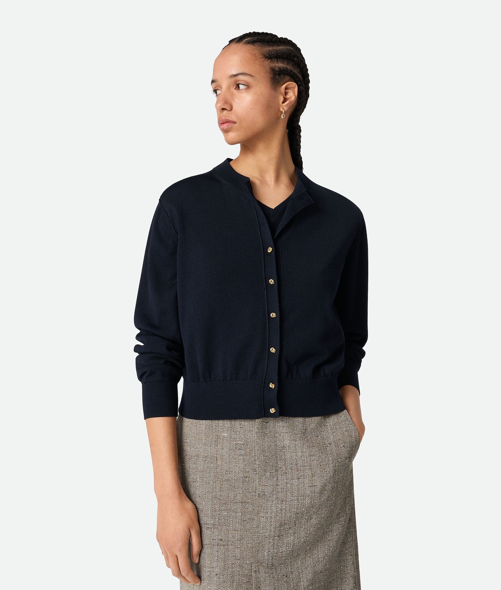 Twinset in lightweight cotton and viscose with knot button detailing. Product Details - Lightweight cotton and viscose twinset - Metal knot buttons - Regular fit - Material: 60% Cotton, 40% viscose - Color: Navy - Made in: Italy - Product code: 841817V5M504121 Size & Fit - Model is 177 cm | 5'9" and is wearing a Bottega Veneta size S
