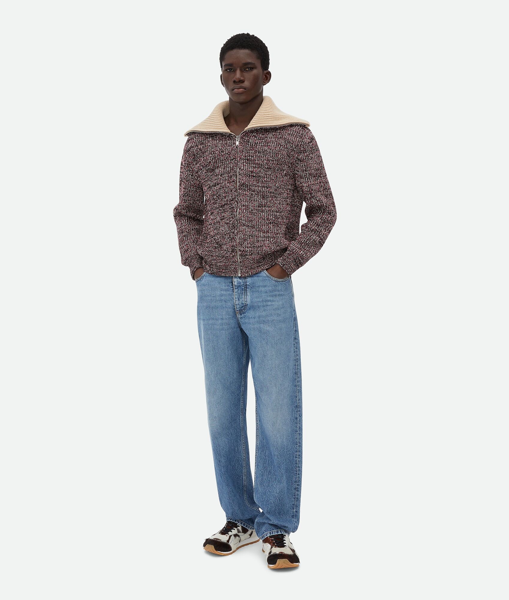Cardigan in ribbed cotton and wool mouline. Product Details - Cotton and wool mouline ribbed cardigan - Zipper closure - Regular fit - Material: 70% cotton, 30% wool - Color: Scarlet Melange - Made in: Italy - Product code: 817821V4WG06451 Size & Fit - Model is 190 cm | 6'2" and is wearing a Bottega Veneta size S