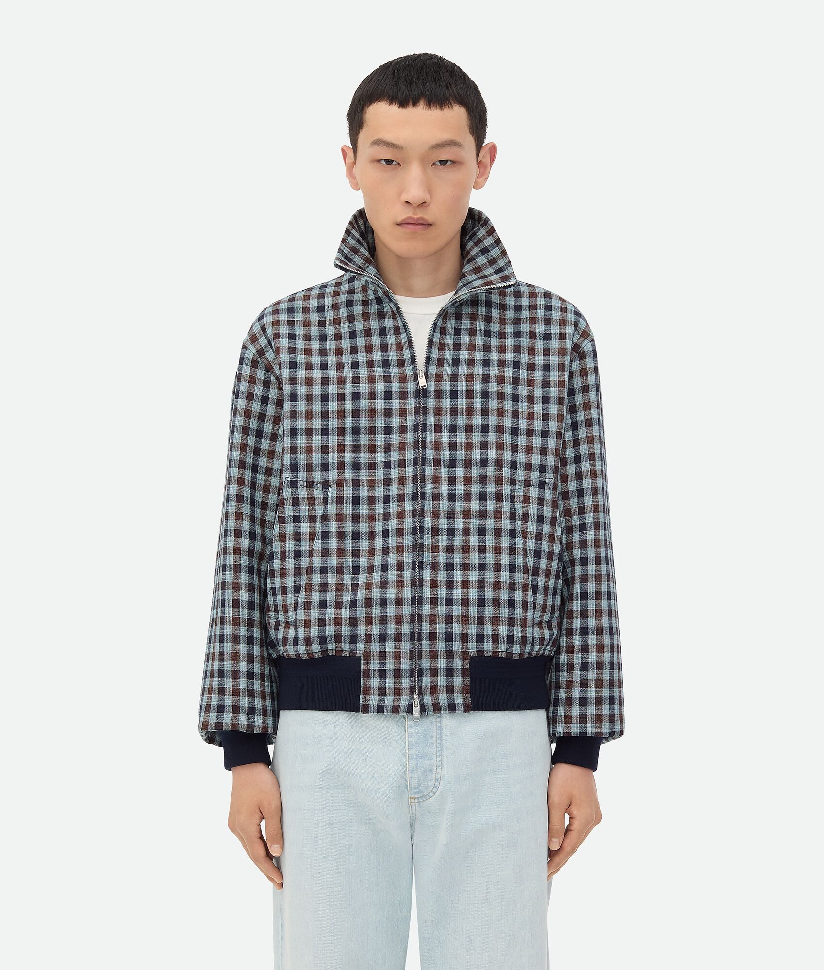 Blouson in gingham structured cotton. Product Details - Structured cotton gingham blouson - Ribbed cuffs and hem - Zipper closure - Lined - Material: 60% cotton, 35% viscose, 5% polyamide - Color: Navy/Lake/Maroon - Made in: Italy - Product code: 811382V4Y804902