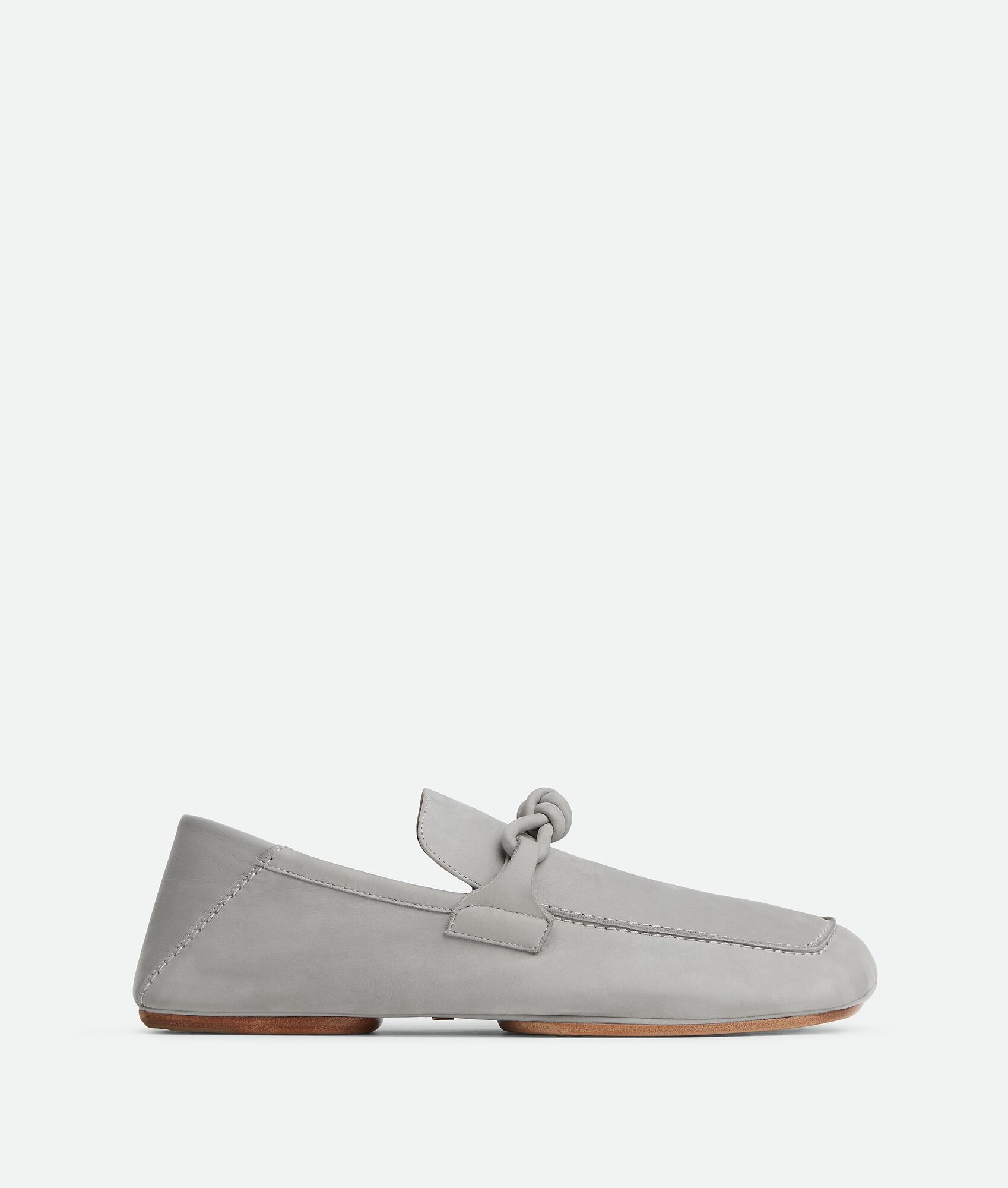 Loafer in nubuck leather with collapsible back and signature leather knot detail. Product Details - Nubuck leather loafer with collapsible back - Signature leather knot detail - Engraved metallic plate positioned on the outsole - Material: Nubuck leather - Lining: Lambskin - Colour: Sterling - Hardware: Brass finish - Leaher outsole - Made in: Italy - Product code: 827136V5E301501