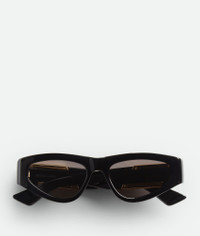 Cat eye sunglasses in polyamide with gold-finished split ribbon detailing. Product Details - Reinterpretation of the classic Bottega Veneta ribbon detail, split at the top and bottom of the temple - Lenses made from polyamide with 39% bio-based content - Frame made from polyamide with 60% bio-based content - Lens width: 53 mm | 2.1"; Bridge length: 18 mm | 0.7"; Temple length: 145 mm | 5.7" - BV1407S 002 - Color: Black/Gray - Made in: Japan - Product code: 841169VBL801049 Material - Material: Polyamide