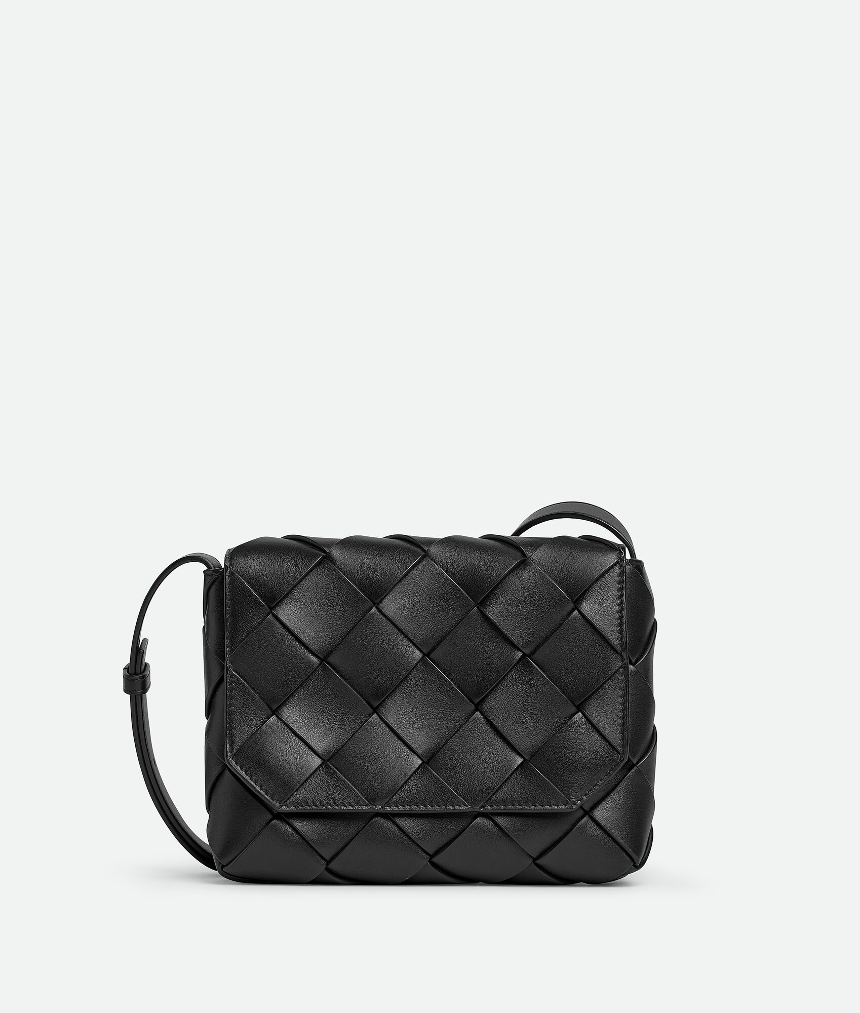 Cross-body bag in smooth Intreccio leather. Product Details - Intreccio smooth leather cross-body bag with adjustable strap - Single interior zipped pocket - Magnetic closure - Material: calfskin - Lining: Suede bonded Intreccio - Color: Black - Hardware: Silver finish - Height: 16.5 cm | 6.5” - Width: 22.5 cm | 8.9” - Depth: 5.5 cm | 2.2” - Strap drop: 57.5 cm | 22.6” - Made in: Italy - Product code: 795637V56A18803