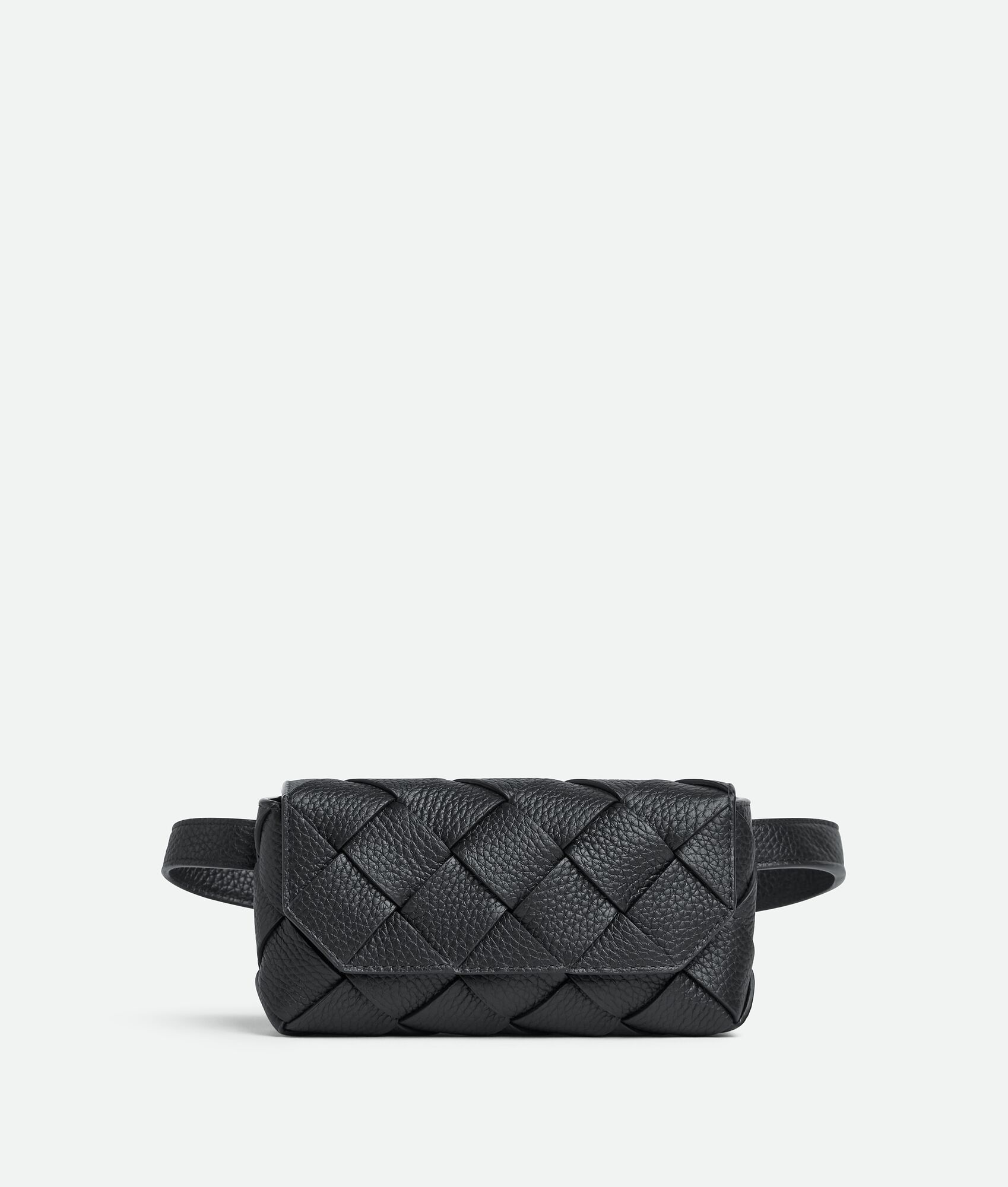 Belt-bag in grained Intreccio leather. Product Details - Grained Intreccio leather belt-bag with adjustable strap - Single interior open pocket - Magnetic closure - Material: calfskin - Lining: Calfskin bonded Intreccio - Color: Black - Hardware: Silver finish - Height: 10 cm | 3.9" - Width: 19 cm | 7.5" - Depth: 5 cm | 2” - Made in: Italy - Product code: 805773V4FV18803