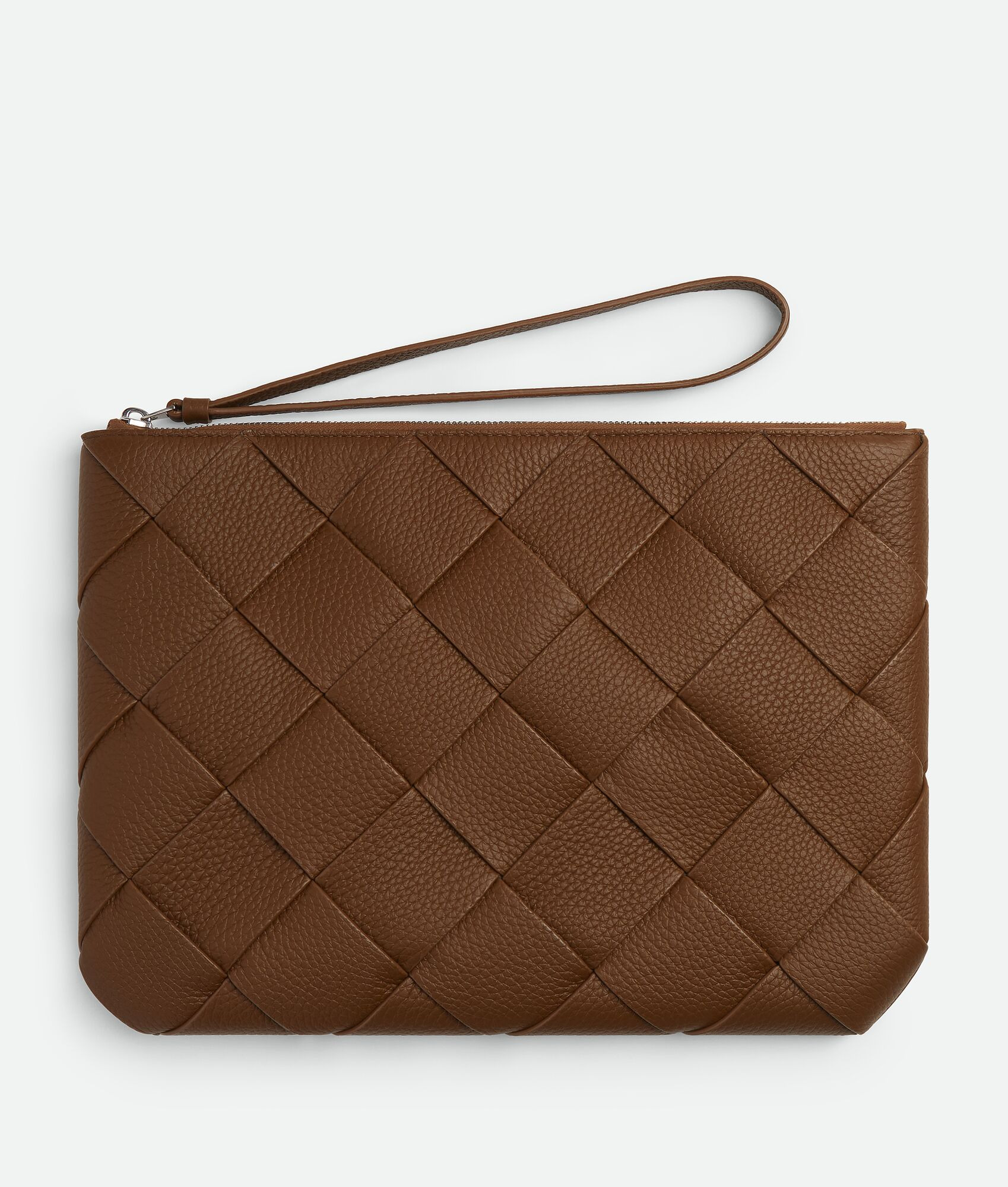 Large pouch in grained Intreccio leather. Product Details - Large wristlet pouch in grained Intreccio leather - Single compartment - Interior leather tag with embossed logo - Zipper closure - Lining: Canvas - Color: Nocciola - Hardware: Silver finish - Made in: Italy - Product code: 795632V4FV12809 Material - Material: Calfskin Size & Fit - Height: 23 cm | 9.1" - Width: 33 cm | 13" - Depth: 2 cm | 0.8" - Handle drop: 23 cm | 9"