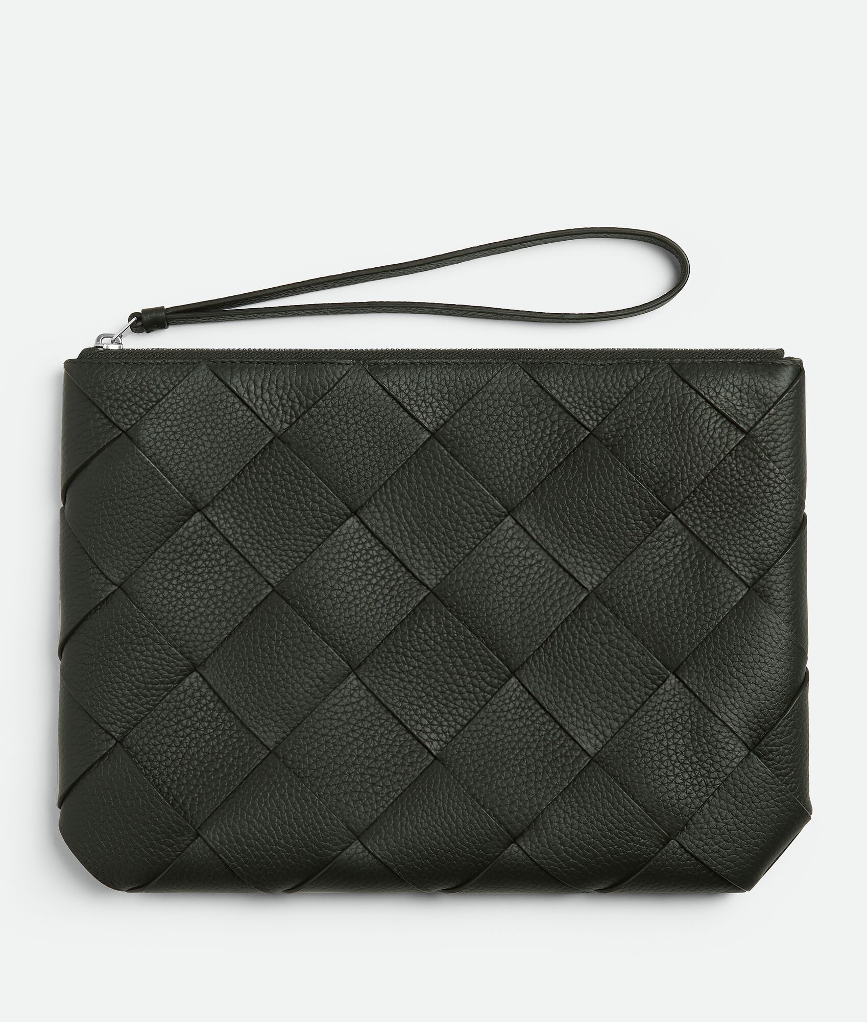 Large wristlet pouch in grained Intreccio leather. Product Details - Single compartment, two interior open pockets - Interior leather tag with embossed logo - Zip closure - Material: Calfskin - Lining: Canvas - Colour: Dark Green - Hardware: Silver finish - Height: 23 cm | 9” - Width: 33 cm | 13” - Depth: 2 cm | 0.8” - Handle drop: 23 cm | 9” - Made in: Italy - Product code: 795632V4FV13009