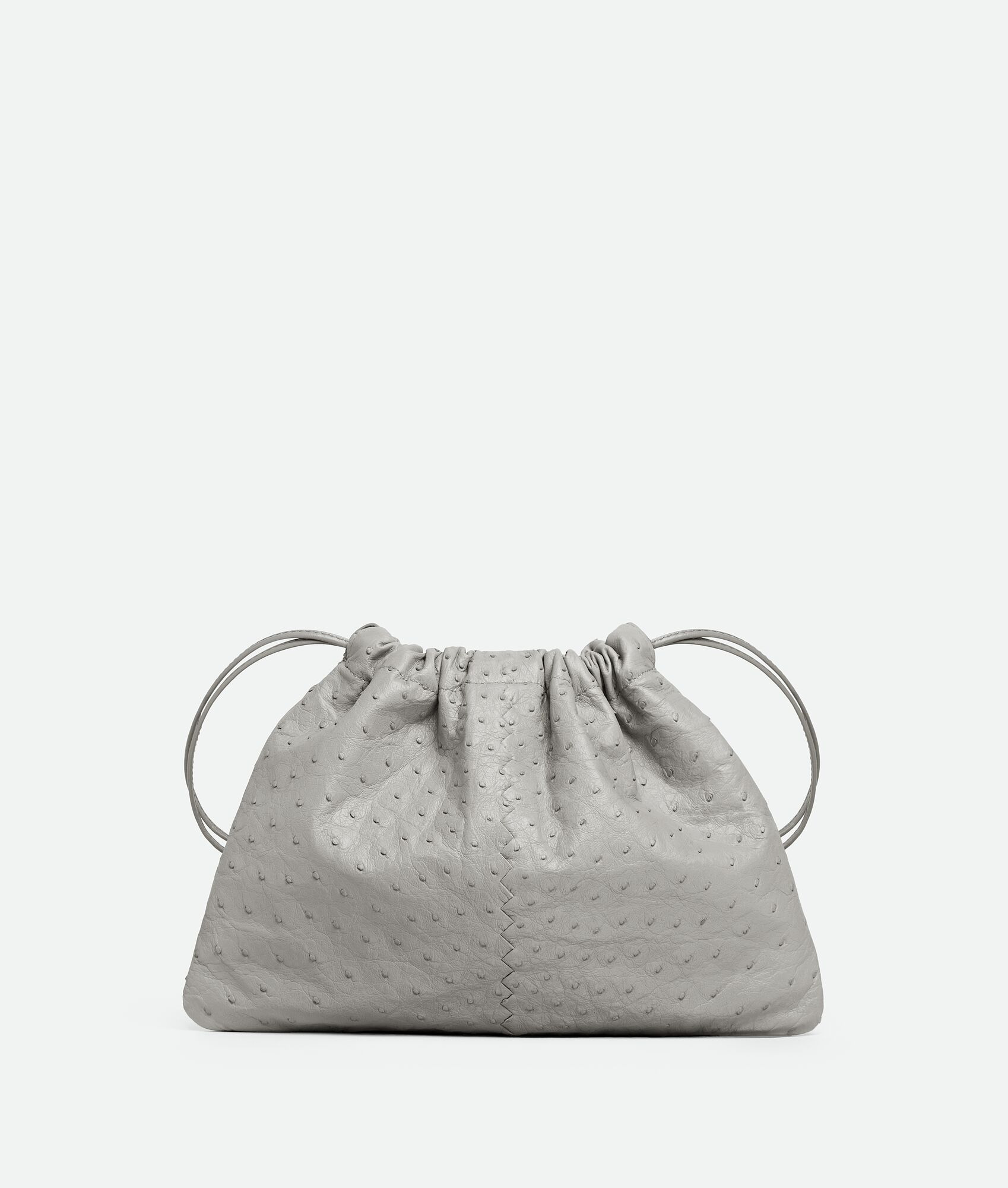 Product Details - Ostrich leather pouch - One main compartment - Drawstring closure - Leather loop attachment with snap button for shoulder carry - Lining: Lambskin - Color: Sterling - Hardware: Gold finish - Made in: Italy - Product code: 796728V3RQ31502 Material - Material: Ostrich, calfskin Size & Fit - Height: 23 cm | 9.1" - Width: 32 cm | 12.6" - Depth: 1 cm | 0.4" - Strap drop: 35 cm | 13.8"