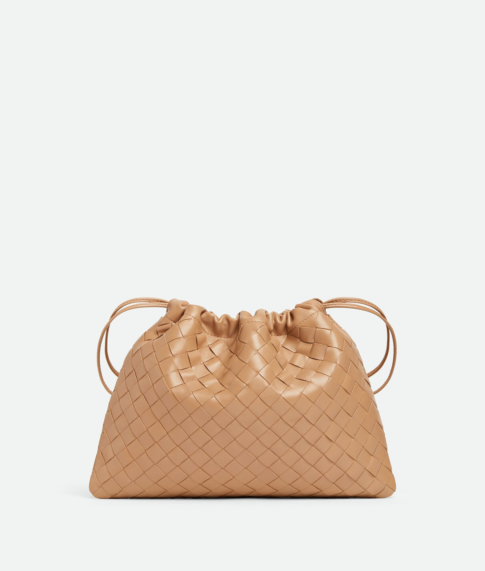Product Details - Intrecciato calfskin leather pouch - One main compartment - Drawstring closure - Leather loop attachment with snap button for shoulder carry - Lining: Nylon - Color: Pale Brown - Hardware: Gold finish - Made in: Italy - Product code: 796728V3IV12787 Material - Material: Calfskin Size & Fit - Height: 23 cm | 9.1" - Width: 32 cm | 12.6" - Depth: 1 cm | 0.4" - Strap drop: 35 cm | 13.8"