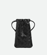 Product Details - Intrecciato calfskin leather case - One main compartment - Drawstring closure - Leather loop attachment with snap button to be easily attached to any handle - Lining: Suede - Color: Black - Hardware: Gold finish - Made in: Italy - Product code: 843968V3IV08425 Material - Material: Calfskin Size & Fit - Height: 19 cm | 7.5" - Width: 11 cm | 4.3" - Depth: 2 cm | 0.8" - Strap drop: 12 cm | 4.7"