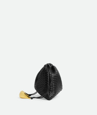Dustbag in Intrecciato piccolo nappa leather with sculptural metallic handle. Product Details - Intrecciato piccolo nappa leather pouch - One main compartment - Drawstring closure - Sculptural metal handle - Lining: Nylon - Colour: Black - Hardware: Muse brass finish - Height: 23 cm | 9.1" - Width: 32 cm | 12.6" - Depth: 1 cm | 0.4" - Strap drop: 35 cm | 13.8" - Made in: Italy - Product code: 837087V4R021019