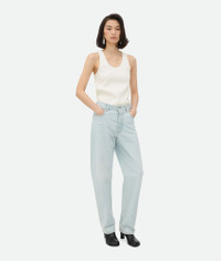 Jeans in extra bleached washed denim. Product Details - Extra bleached wash jeans - Wide leg - Mid-rise waist - Turned up hem - Button fly - Intrecciato suede back patch - Material: 100% cotton - Color: Light Blue - Made in: Italy - Product code: 813502V4ZR04132 Size & Fit - Model is 178 cm | 5'10" and is wearing a Bottega Veneta size 38