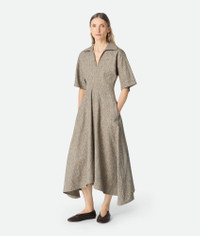 Pleated short sleeved midi dress in fleck viscose. Product Details - Fleck viscose pleated short-sleeved midi dress - Zipper closure - Regular fit - Color: Sahara Mel/Multi - Made in: Italy - Product code: 844011V5CC02641 Material - Material: 40% Viscose, 27% Cotton, 16% Mulberry silk, 8% silk, 7% polyester, 2% linen Size & Fit - Model is 177 cm | 5'9" and is wearing a Bottega Veneta size 38