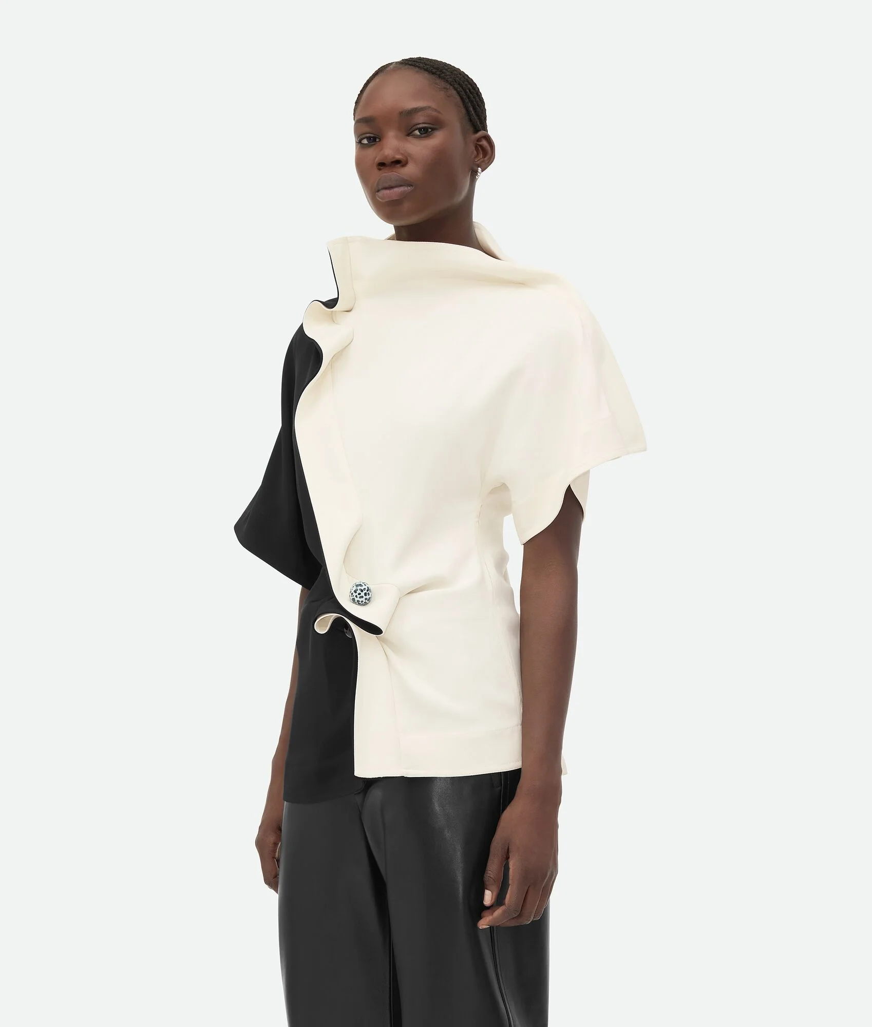 Top in fluid stretch viscose with piercing detail. Product Details - Fluid stretch viscose top - Piercing detail - Zip closure - Unlined - Material: 96% viscose, 4% elastane - Color: Black/Dove - Made in: Italy - Product code: 797412V3Z101036 Size & Fit - Model is 181 cm | 5'11" and is wearing a Bottega Veneta size 38
