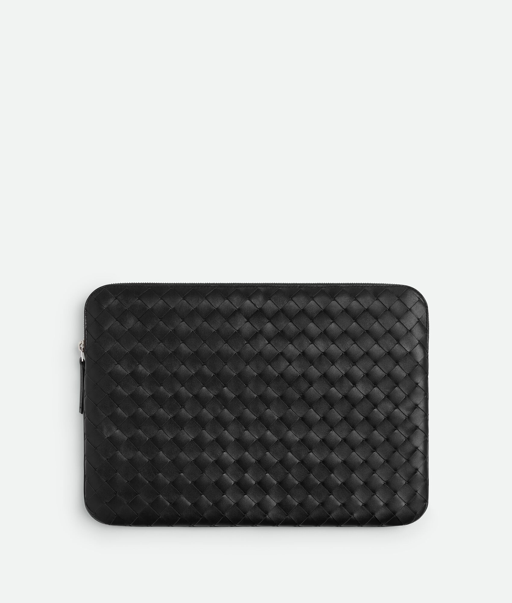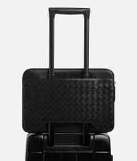 Document case in soft Intrecciato calf leather with back belt. Product Details - Intrecciato document case - Back belt to fit on trolley - Two interior flat open pockets - Zip closure - Material: calfskin - Lining: Canvas - Color: Black - Hardware: Silver finish - Height: 25 cm | 9.8" - Width: 36 cm | 14.2" - Depth: 2.5 cm | 1" - Made in: Italy - Product code: 786664V2HL18803