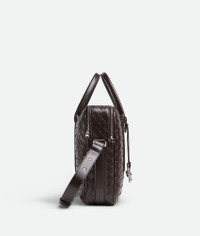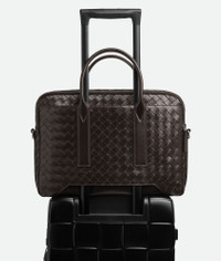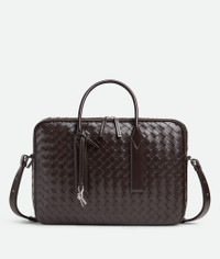 Briefcase in soft Intrecciato leather with adjustable strap and signature knot detail. Product Details - Large Intrecciato briefcase with adjustable and removable strap - Exterior flat pocket and back belt to attach to a trolley - Two zipped compartments with a padded laptop compartment and one zipped pocket - Zip closure - Material: calfskin - Lining: Canvas - Colour: Fondant - Hardware: Silver finish - Height: 28.5 cm | 11.2" - Width: 39 cm | 15.4" - Depth: 8 cm | 3.1" - Handle drop: 12 cm | 4.7" - Strap drop: 38 cm | 15" - Made in: Italy - Product code: 766361V2HL12145