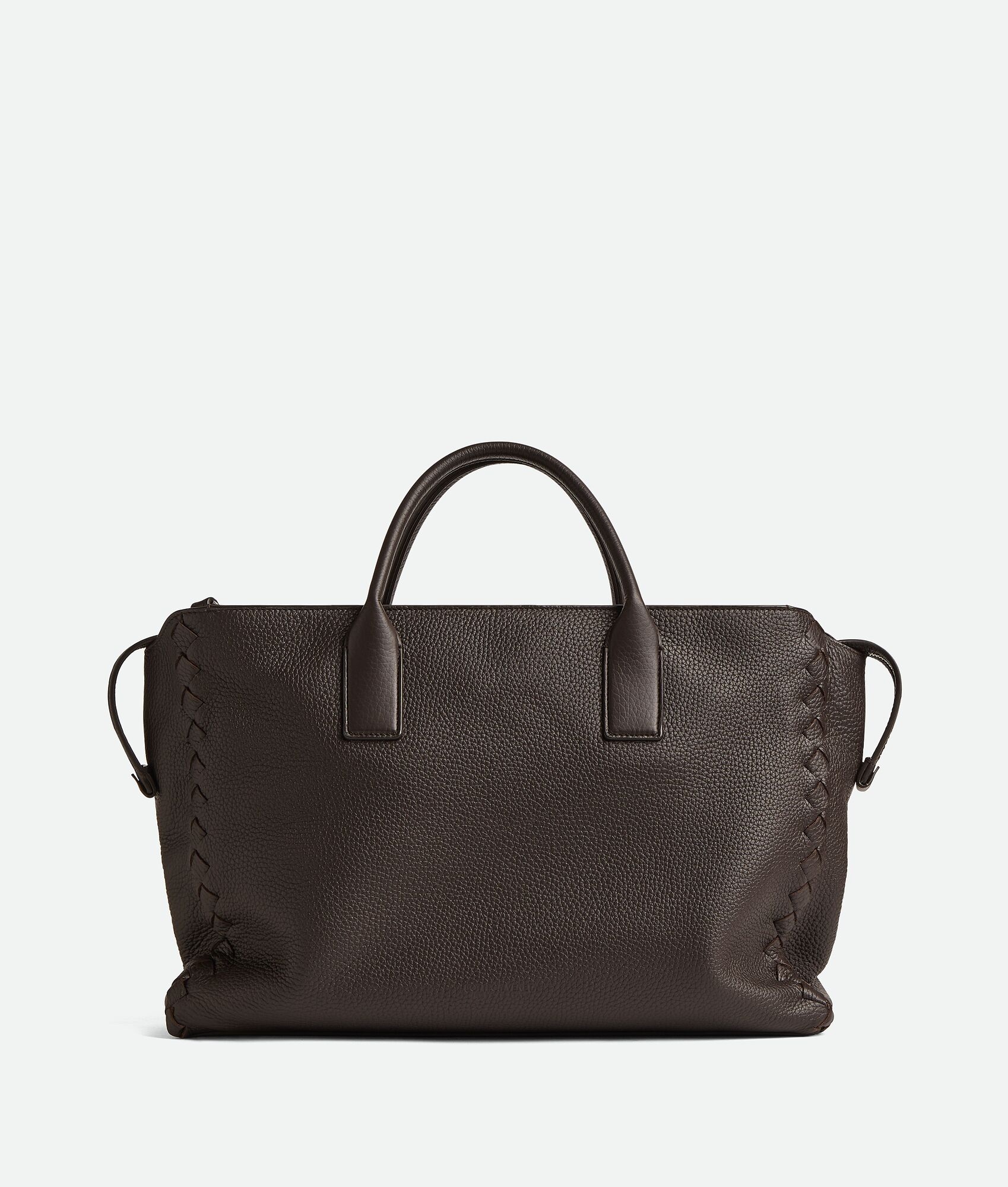 Briefcase in grained leather with Intrecciato details. Product Details - Grained leather briefcase with Intrecciato details - Two interior open pockets, one zipped pocket and key hook on a strap - Zipper closure - Material: Calfskin - Lining: Suede - Color: Fondant - Hardware: Silver finish - Height: 30 cm | 11.8" - Width: 40 cm | 15.7" - Depth: 11 cm | 4.3" - Made in: Italy - Product code: 836014V4FW12145 Size & Fit - Fits a 16" laptop, A4 documents, and a tablet