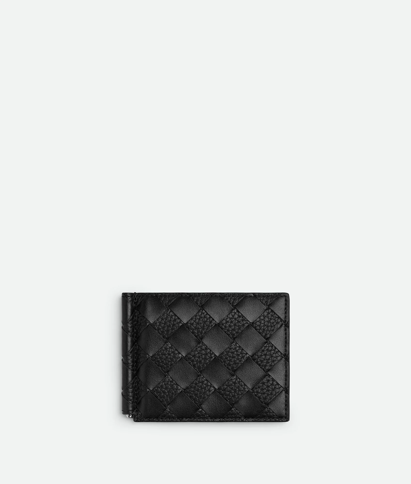 Bi-fold wallet in contrasted Intrecciato smooth and grainy calf leather. Product Details - Intrecciato calfskin leather wallet - Six card slots, one metal clip - Lining: Calfskin - Color: Black - Hardware: Silver finish - Made in: Italy - Product code: 749404V63U18803 Material - Material: Calfskin Size & Fit - Height: 9 cm (3.5") - Width: 11.5 cm (4.5") - Depth: 0.5 cm (0.2")