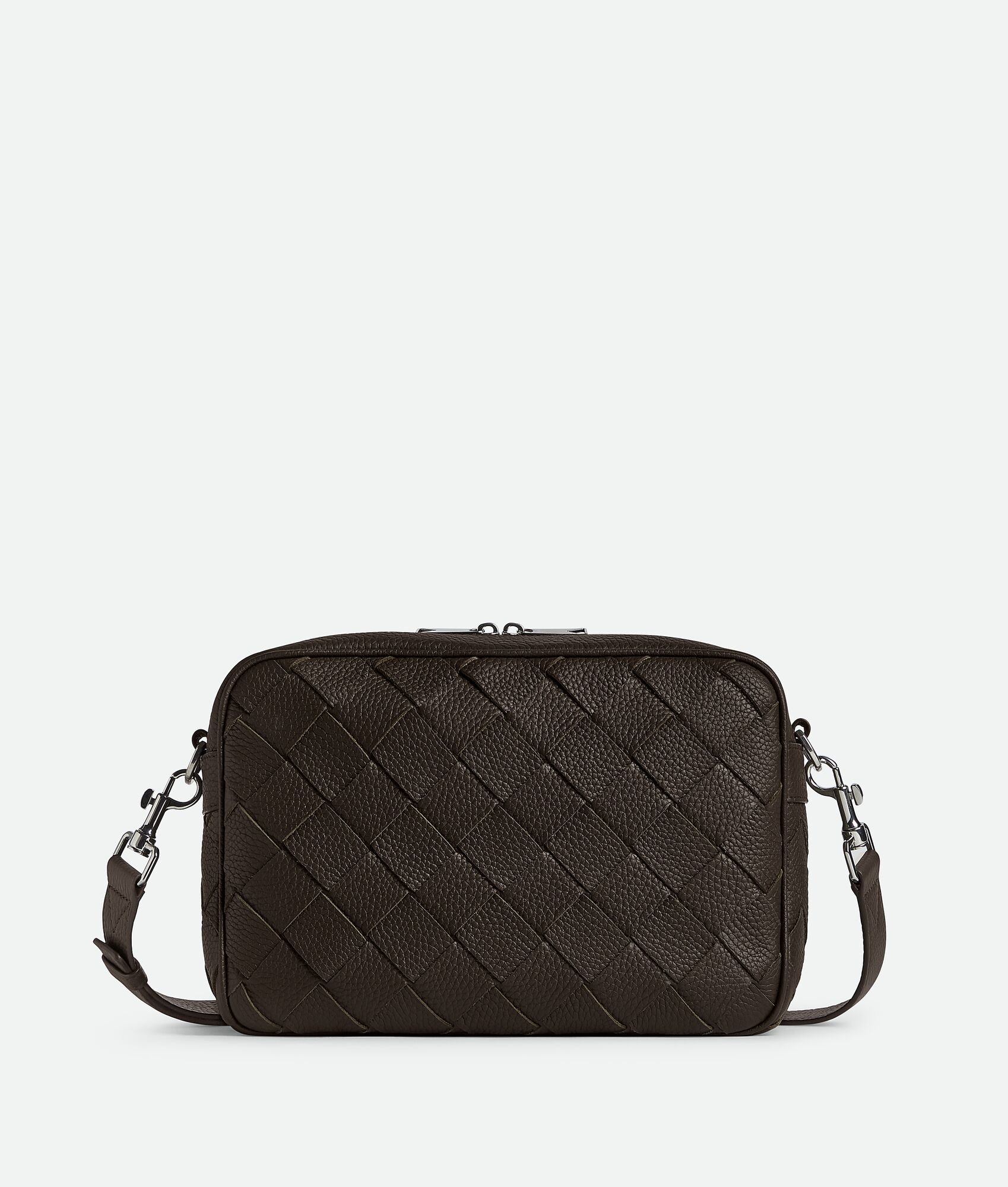 Cross-body bag in Intrecciato grained leather with detachable strap and metal D-ring. Product Details - Intrecciato grained leather cross-body bag with detachable strap and metal D-ring - One interior zipped pocket with leather trimming, one open pocket in canvas - Zip closure - Material: calfskin - Lining: Canvas - Color: Fondant - Hardware: Silver finish - Height: 19.5 cm | 7.7” - Width: 29 cm | 11.4” - Depth: 7.5 cm | 2.9” - Strap drop: 55 cm | 21.7” - Made in: Italy - Product code: 755925V4G312145