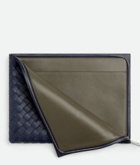 Zipped pouch in Intrecciato calf leather with contrasted interior. Product Details - Intrecciato calf leather pouch with contrasted interior - Single interior open pocket - Zipper closure - Material: Calfskin - Lining: Calf leather - Color: Abyss/Cypress - Hardware: Silver finish - Height: 24.5 cm | 9.6" - Width: 33 cm | 13" - Depth: 2 cm | 0.8" - Made in: Italy - Product code: 607479VCPQ53262