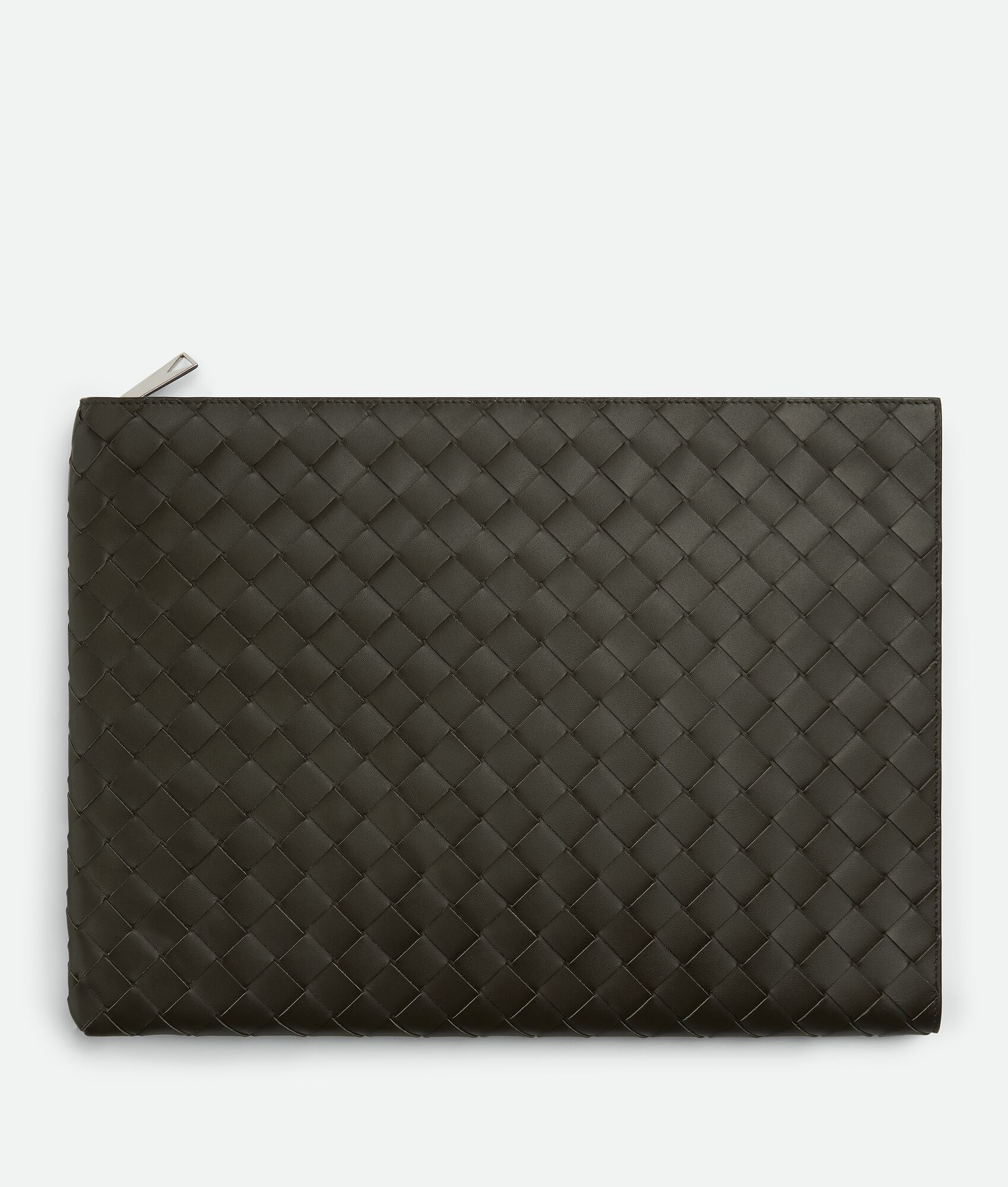 Intrecciato calfskin leather pouch with contrasted interior. Product Details - Single interior open pocket - Zipper closure - Material: calfskin - Lining: Calfskin - Color: Kaki/Dark Praline - Hardware: Silver finish - Height: 24.5 cm | 9.6" - Width: 33 cm | 13" - Depth: 2 cm | 0.8" - Made in: Italy - Product code: 607479VCPQ53394