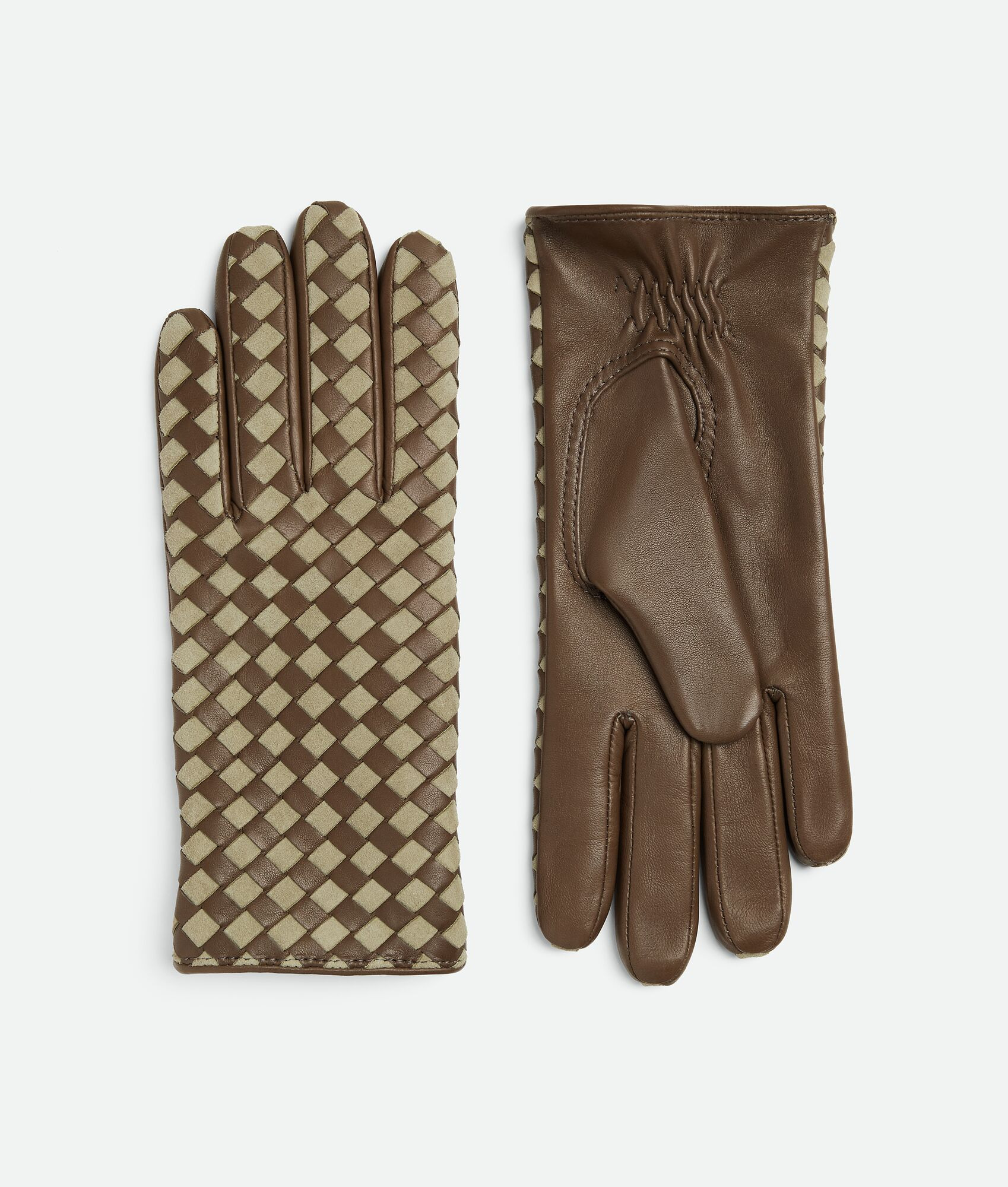 Gloves in soft Intrecciato nappa leather and suede with cashmere lining. Product Details - Intrecciato soft nappa and suede leather gloves - Lined in cashmere - Color: Liana/Travertine - Made in: Italy - Product code: 845628V5ZJ09565 Material - Material: 100% Lambskin